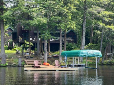 Year-round Cranberry Lake house, perfect for large multi-generational families, features private setting on Matilda Bay, 107' waterfront with swimming, dock, fishing boat, 3 kayaks, canoe and 3 paddleboards. Rental includes a 14' Voyager Discovery fishing boat with a 9.9 hp motor and a trolling motor. Also you can bring your motor boat if preferred. There's a large yard to play games, relax and enjoy the Adirondack park. The fire pit is by the waterfront for campfires. The three level custom …home boasts a two-story great room with floor to ceiling fireplace, gourmet kitchen, 5 bedrooms, with the library and game room functioning as the 6th and 7th, 3.5 baths; altogether 3,600 sq ft of comfortable living. There is a large wrap-around deck to grill meals and enjoy the views. Deck includes a 9x11 screened room, ideal for reading, games and conversation. All the bedrooms are spacious with easy access to the bathrooms. The ground floor includes a laundry room, a 2nd kitchen with sink and small refrigerator and an unfinished game room with a sitting area, 3 beds, and walk-out to the lake. Our home is all about location and the Adirondack lifestyle. We have done our best to ensure we provide a carefully crafted experience. Even if it rains, we have you covered, there is plenty of space inside to spread out, play games, watch movies, listen to music and just enjoy. Located in the heart of the Adirondacks, there are countless hiking and snowmobile trails. Saranac Lake and Lake Placid are an hour away, both provide great shopping and dining. Come stay at our Adirondack home and create memories that will last a lifetime!