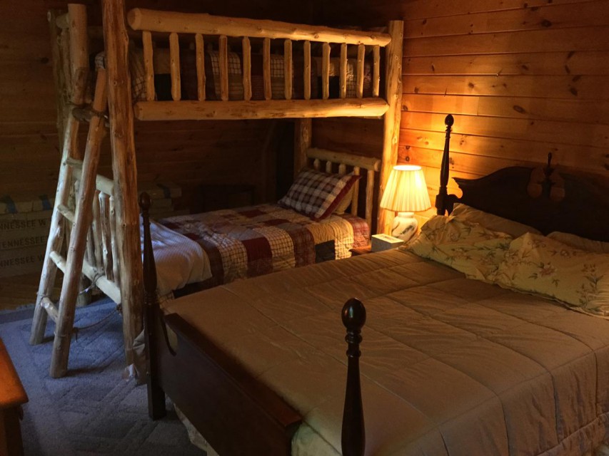 The Lodge is a six bedroom, 3 bath house which can accommodate up to 15 guests at a time. On the first floor, the … North Woods Suite has a king bed and en-suite bathroom with bathtub shower combination. The First Floor also has a great room with wood burning fireplace, kitchen /dining room. On the second floor is a full bathroom with shower and three bedrooms: the Skylight room has three skylights and a queen bed sleeping two; Huck's Hideaway has a montana log queen bed. and three twins, two of which are a trundle, and the Bear Cave has a bunk bed of two twins, Plus a queen. The ground level has the game room, with ping pong, propane fireplace, large screen TV, two bedrooms, Lakeview and the Pines, each with a new Cedar wood log queen, and a full bathroom with shower.