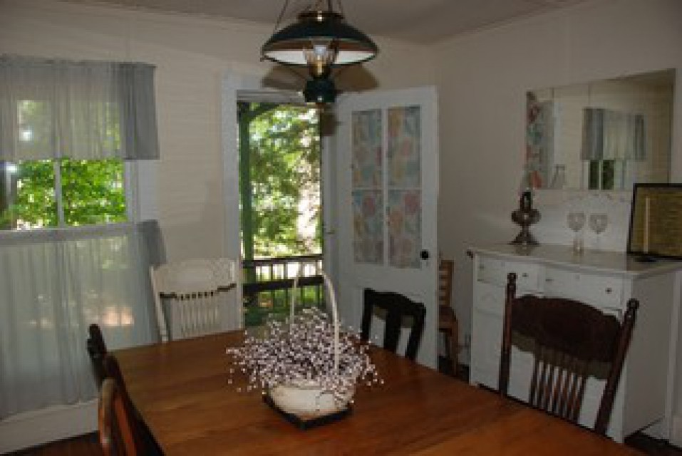 The first floor has narrow plank natural oak floors in the large living room and the dining room. The kitchen is ample with an electric stove, refrigerator, and all basic utensils and small appliances. A rear room behind the kitchen contains a single child's bed and recently renovated full bathroom with a shower.